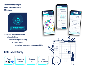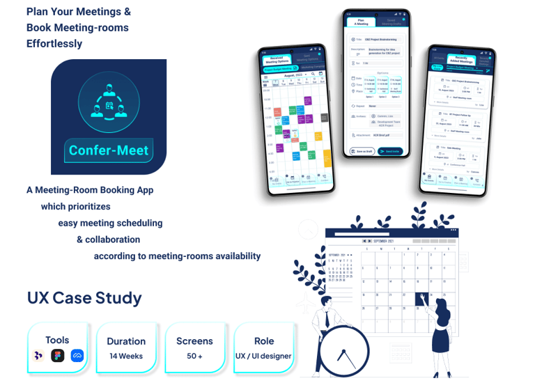 For my solo UX case study for a course work, I developed a meeting-room booking app using the design thinking process. Conducting secondary research and user interviews, I created an empathy map, persona, and a user journey map. I utilized key insights to construct a diagram illustrating users' processes, needs & challenges, forming a foundation for the solution concept and the entire app. I applied the glassmorphism style to implement my idea. Following UI design, I conducted usability testing with Maze, measuring success, duration, error rates, task satisfaction, and overall usability.